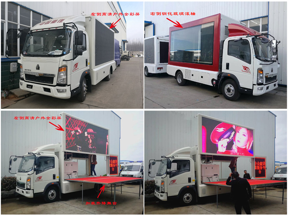 廣告車選裝配置:客戶可根據(jù)需求選裝屏幕清晰度(P10彩屏、P8彩屏、P6彩屏、P5彩屏、P4彩屏)、單面彩屏、雙面彩屏、雙面